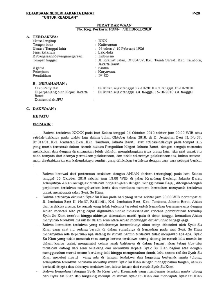 Dirham tidak ditahan karena melakukan tindak pidana penipuan dengan ancaman pidana penjara paling lama empat tahun dibawah lima tahun. Berikut merupakan contoh dari surat dakwaan alternatif : 28.10.2017 · contoh surat dakwaan alternatif contoh surat dakwaan alternatif kejaksaan negeri. 10.12.2018 · adapun contoh tindak pidana yang dapat tergolong dalam surat dakwaan alternatif adalah pencurian (pasal 362 kuhp) dan penadahan (pasal 480 kuhp). Contoh surat dakwaan alternatif kejaksaan negeri jakarta selatan jalan rambai nomor 1 kebayoran baru, jakarta selatan "untuk keadilan" surat dakwaan no: